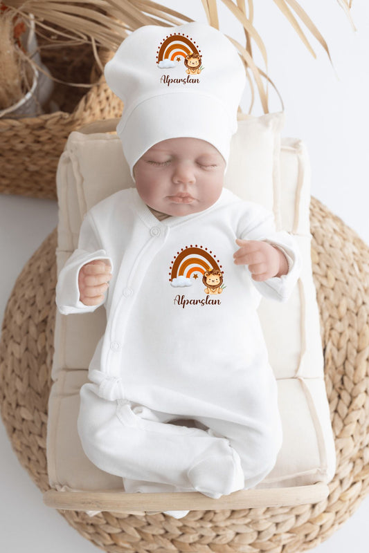 İsime Özel %100 Pamuk Baskılı 11’li Organik Bebek Hastane Çıkışı Aslan Gökkuşağı Modeli