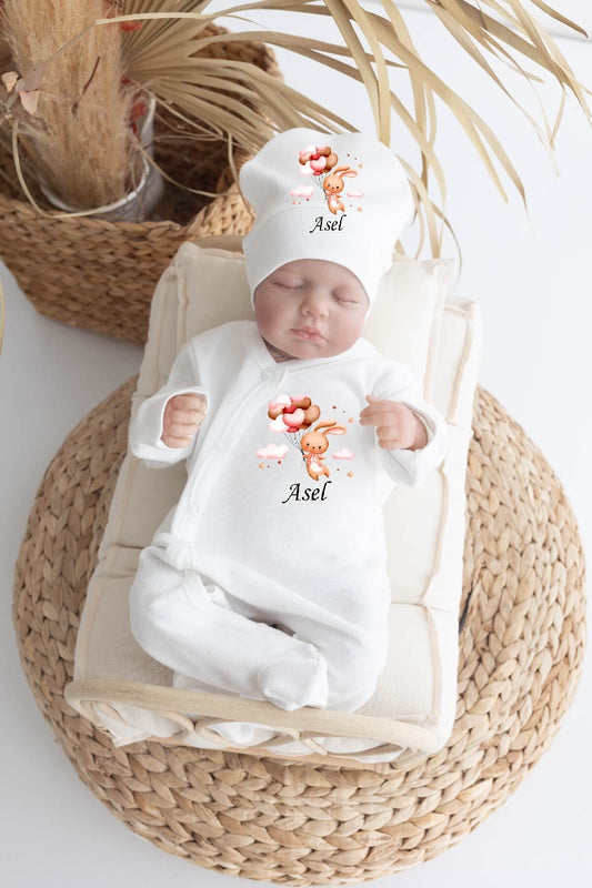 İsime Özel %100 Pamuk Baskılı 11’li Organik Bebek Hastane Çıkışı Balonlu Tavşan Modeli