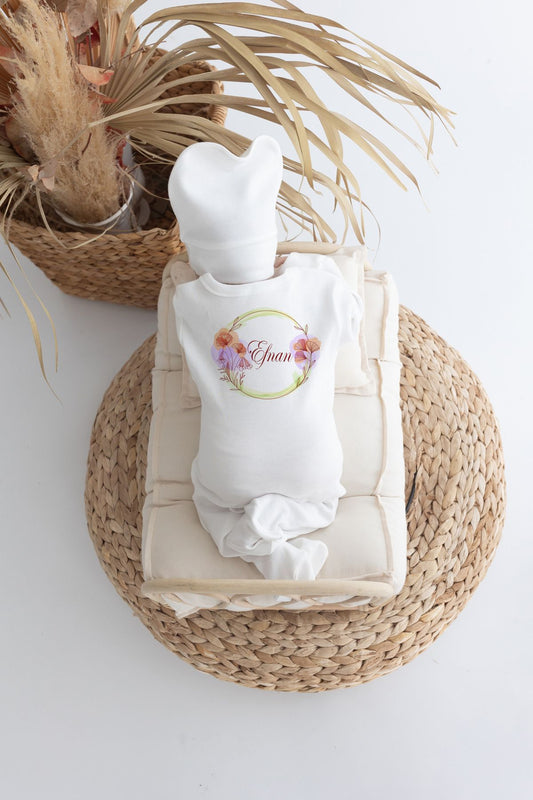 İsime Özel %100 Pamuk Baskılı 11'li Organik Bebek Hastane Çıkışı Pamuklu Çiçek Modeli