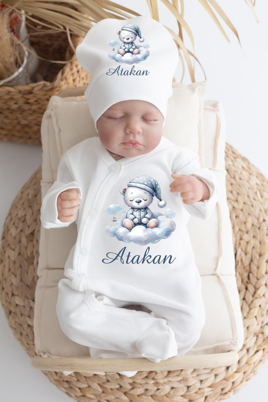 İsime Özel %100 Pamuk Baskılı 11’li Organik Bebek Hastane Çıkışı Uykucu Kutup Ayısı Modeli M76