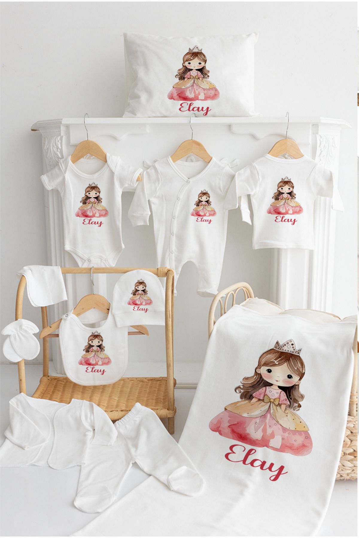 İsime Özel %100 Pamuk Baskılı 11’li Organik Bebek Hastane Çıkışı Pembe Prenses Moldeli