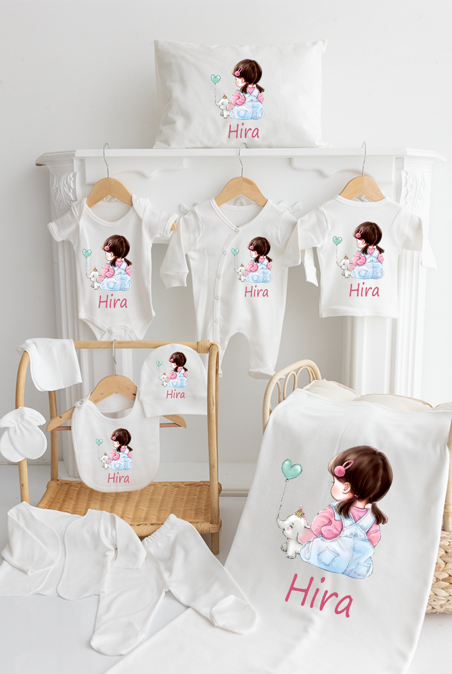 İsime Özel %100 Pamuk Baskılı 11’li Organik Bebek Hastane Çıkışı Arkası Dönük Kız Modeli M77