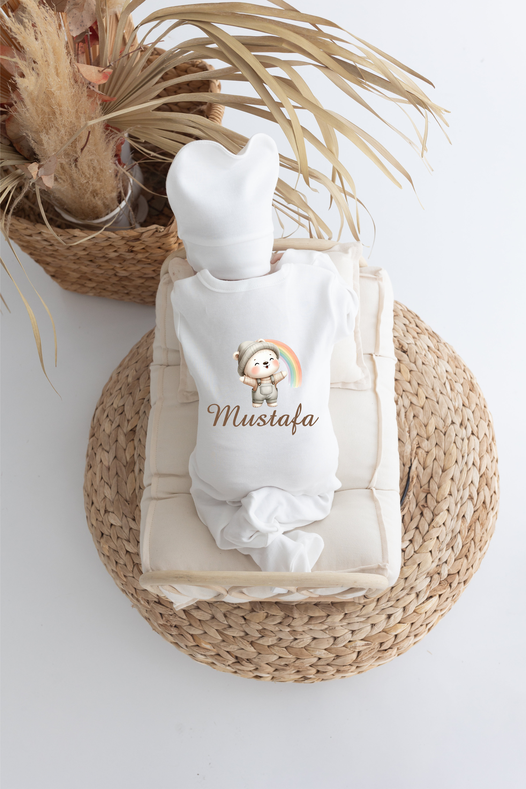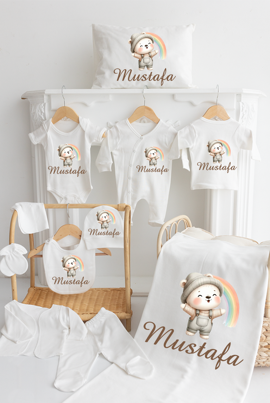 İsime Özel %100 Pamuk Baskılı 11’li Organik Bebek Hastane Çıkışı Gökkuşağı Renkli Ayı Modeli M78